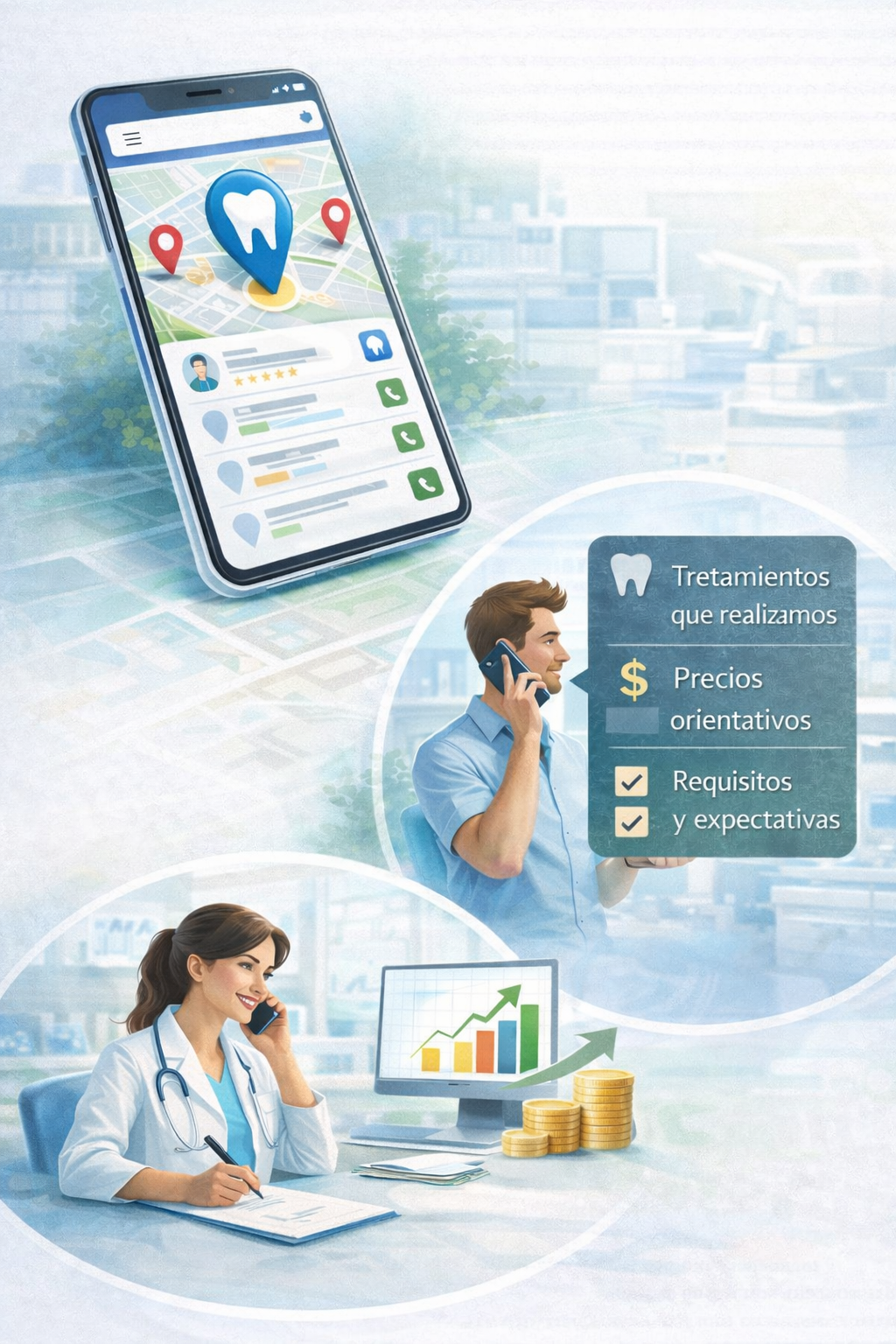 Un sistema local para clínicas dentales que organiza tu presencia en Google Maps, filtra pacientes de bajo valor y convierte búsquedas locales en tratamientos que sí se completan.